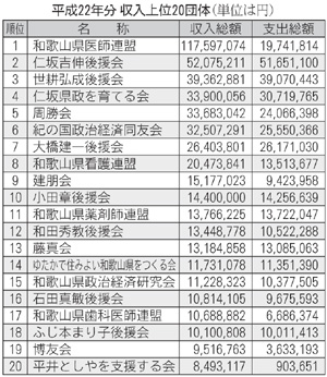 政党の収入総額は10億8491万円(同1・3%減)。内訳は、政治資金パーティーなどの事業収入が前年の3倍以上の1億123万円と大幅に増えた。政党別では、自民党(5億290万円、0・2%増)がトップ、以下、共産党(3億3668万円、1・7%減)、民主党(1億4798万円、6・1%減)、公明党(8421万円、2・6%増)、社民党(1312万円、12・4%減)など。支出総額は8億1090万円(5・3%減)で、内訳は選挙関係費が4876万円(71・5%増)、政治資金パーティー開催事業費が1620万円(71・2%増)と大幅に増えた。その他の政治団体は収入総額が8億1386万円、支出総額が5億599万円。収入上位団体では、仁坂吉伸後援会が21年に5位だったところを2位に順位を上げている。