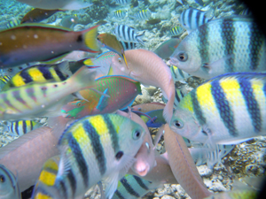 たくさんの魚たちが手に持っているクッキーみたいなエサ?をつつきにきました。