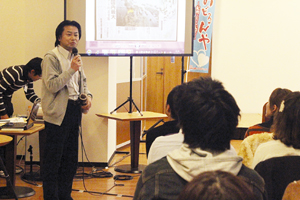 県スポーツ振興財団が主催し、ことしで3回目。乗馬クラブ「ライディングクラブ・グリーンオアシス」(同市平井)の平原美津枝さん(56)が「馬は後ろから追い掛けられたり、大きな声を出すと驚くので気を付けてね」と注意事項を説明。平原一樹クラブ長(56)がサラブレッドのミニモニ君に乗って、並足、早足、駆け足の模範演技を披露した。