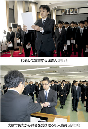 市長部局代表の島本恭平さん (26) と消防局代表の木本茂希さん (24) が 「全体の奉仕者として、誠実かつ公正に職務を執行することを誓います」 と宣誓。 大橋建一市長は職員に求める姿勢として、市民の立場で考えること、 時代の変化に敏感であることなどを挙げ、 「積極的に仕事に取り組み、 自分から勉強し、 早く一人前になってほしい」 と激励した。
