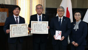 贈呈式では、奥村会長が樫畑理事長に目録を手渡し、樫畑理事長が奥村会長に感謝状を手渡した。