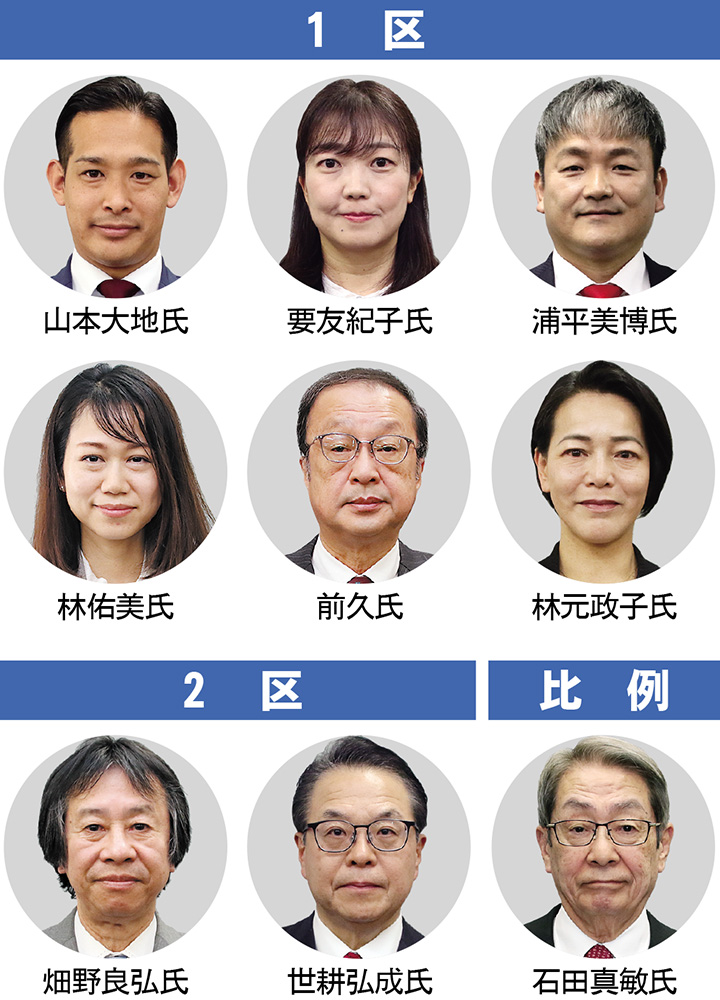 県内選挙区の構図も前回とは大きく異なる。1区は前回、自民の山本氏が当時維新の林氏に124票差で勝利したが、比例で復活当選した林氏は維新を昨年10月に離党し、今回は国民からの出馬。議席を失った維新は浦平氏を擁立し、与党同士が戦うことになる。中道の要氏の出馬に伴い、立憲候補の支援も選択肢としていた共産は独自候補の前氏擁立に動いた。昨年9月に最も早く出馬表明した参政の林元氏は、同7月の参院選で躍進した党勢をさらに拡大すべく、先行して運動してきた。