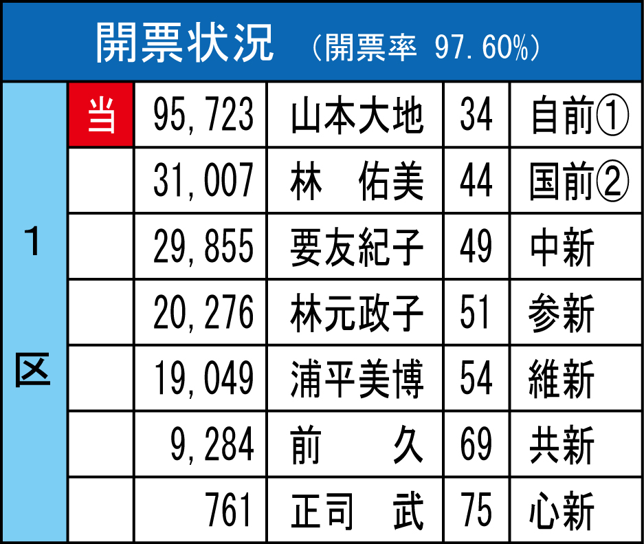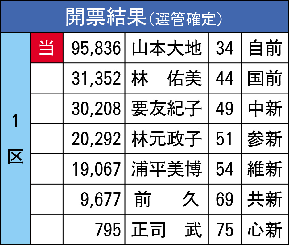 第51回衆院選が8日、投開票され、7人が立候補して混戦となった和歌山1区は、自民前職の山本大地さん(34)が当選を確実にした。山本さんは2期目に向け「和歌山の発展が日本の発展につながる。国会でも叫び続け行動に移したい。感謝と決意を持って全力で頑張ります」と決意した。