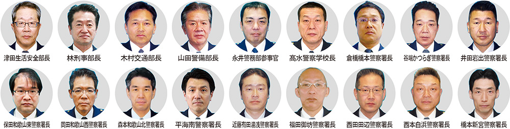 県内12署の警察署長のうち、11人が交代となり、岡田西署長の他、岩出署長に井田昌樹刑事部参事官・生活安全部参事官・警備部参事官(組織犯罪対策担当)、東署長に保田彰生活安全部参事官・警務部参事官・刑事部参事官・交通部参事官・警備部参事官(サイバーセキュリティ担当)、北署長に森本仁生活安全部参事官・刑事部参事官、海南署長に平哲治刑事部理事官・刑事部捜査第一課長、有田湯浅署長に近藤健かつらぎ署長、御坊署長に福田智哉刑事部理事官・刑事部鑑識課長、田辺署長に西田文貴橋本署長、橋本署長に倉橋晶警務部理事官・警務部監察課長、かつらぎ署長に谷端啓司交通部理事官・交通部交通指導課長、白浜署長に西本浩一刑事部理事官・刑事部科学捜査研究所長が就任する。