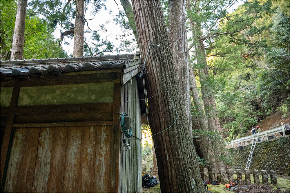 森の中も当然安全面の注意が必要ですが、建物付近や集落内での伐倒はさらに難易度が上がり、寺社仏閣の樹木伐倒ともなると、社殿や境内を守りながら進める高度な技術が求められます。