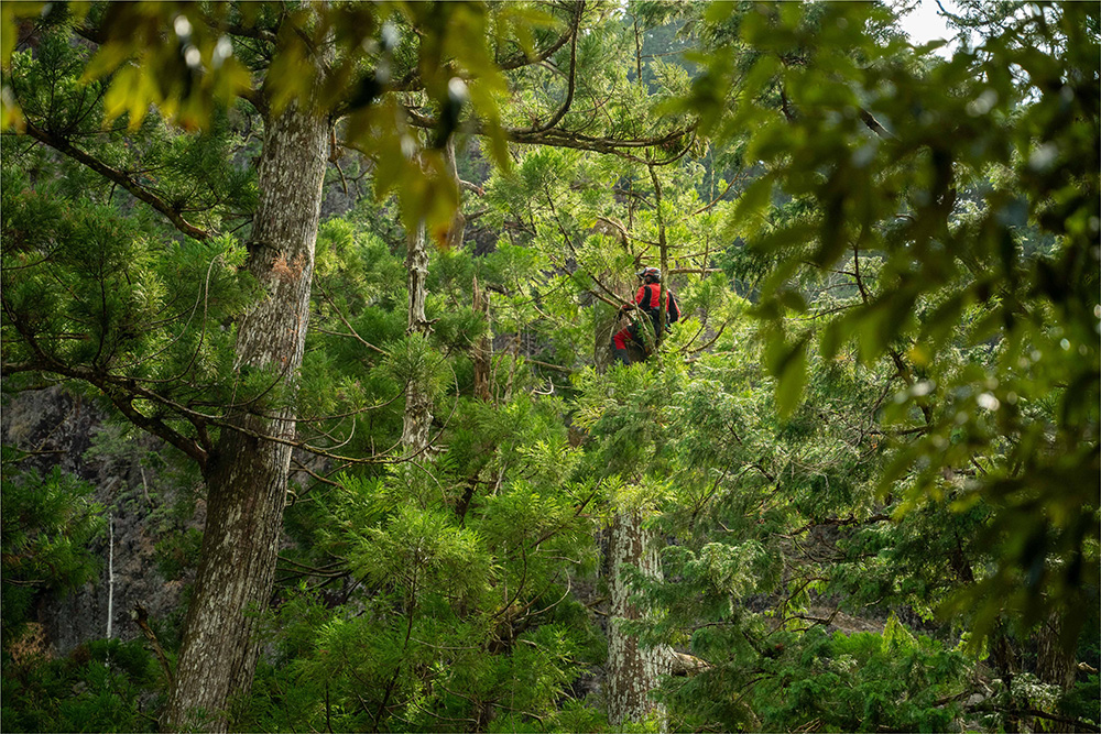 作業は2日間にわたり、鳥羽山さんの勤める熊野川森林組合の仲間と共に3人体制で行われました。使用するチェーンソーは刃渡り1メートルを超える特大サイズ。クレーンで樹上まで上がったあとは、上から順に伐り進めていきます。
